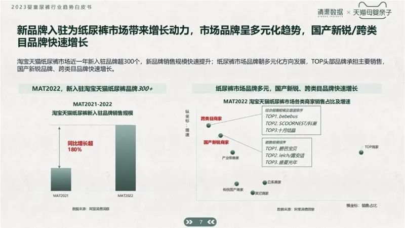 根據(jù)白皮書數(shù)據(jù)統(tǒng)計,近兩年淘系紙尿褲市場新入駐品牌超300個。新品牌銷售規(guī)??焖偬嵘?,市場品牌呈多元化趨勢,國產(chǎn)新銳以及跨類目品牌也在快速增長。同時,bebebus、十月結(jié)晶、科巢等品牌先繼進入紙尿褲市場,給市場帶來源源不斷的活力。